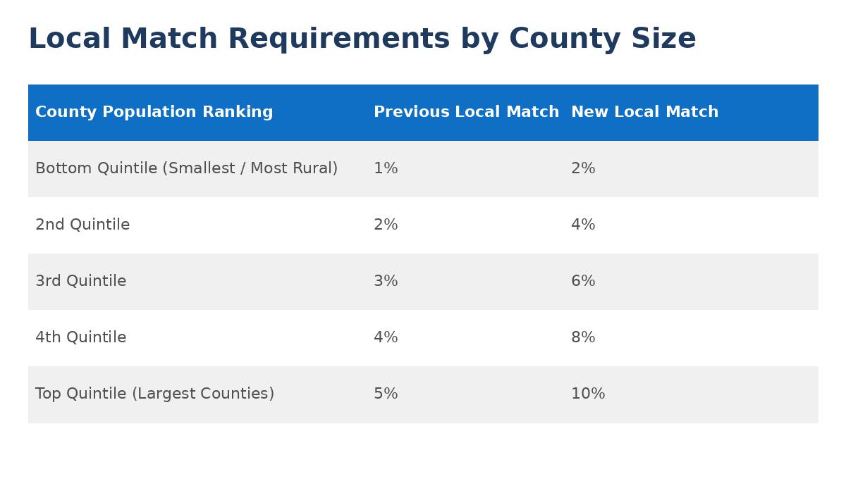 - Increased Local Match Requirements. Starting July 1, 2026, HB 647 outlines increased local match requirements based on county population rankings, organized by quintiles. Here's how the former and new rates compare: