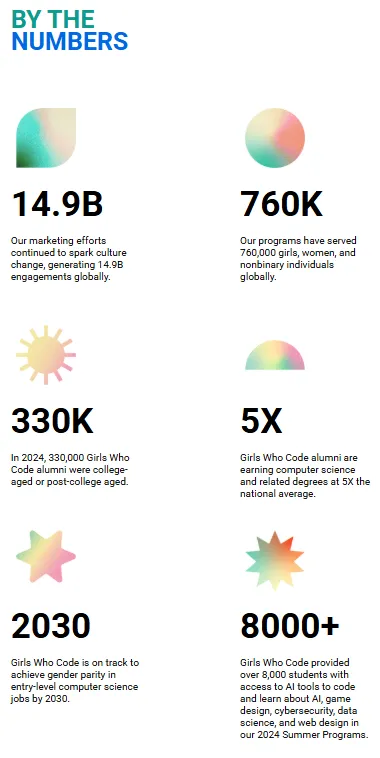 Girls Who Code’s 2024 report does a good job of this in their 2024 impact report. Notice how, instead of merely saying “Our marketing efforts resulted in 14.9B engagements globally”, they frame this stat in terms of impact by tying it to “culture change.”